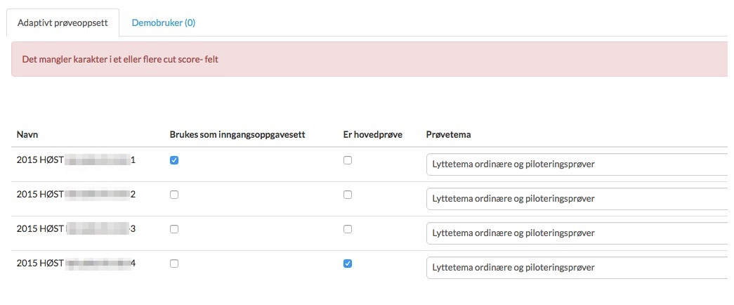Når man er ferdig med reglene, er det viktig å fjerne krysset på de oppgavesettene man ikke ønsker skal være inngangsoppgavesett og markere hvilket sett som er hovedprøven.
