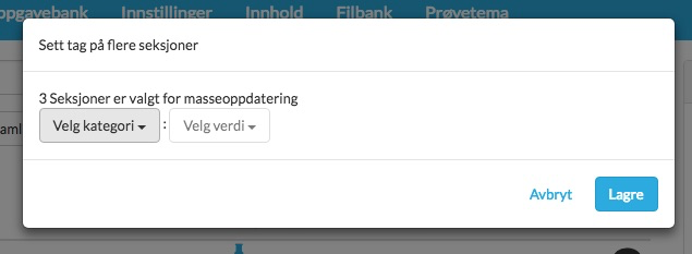 Velg først Kategori fra nedtrekksmenyen og så Verdi. Trykk deretter på Lagre. Legg merke til at det står hvor mange seksjoner du er i ferd med å endre tag på.